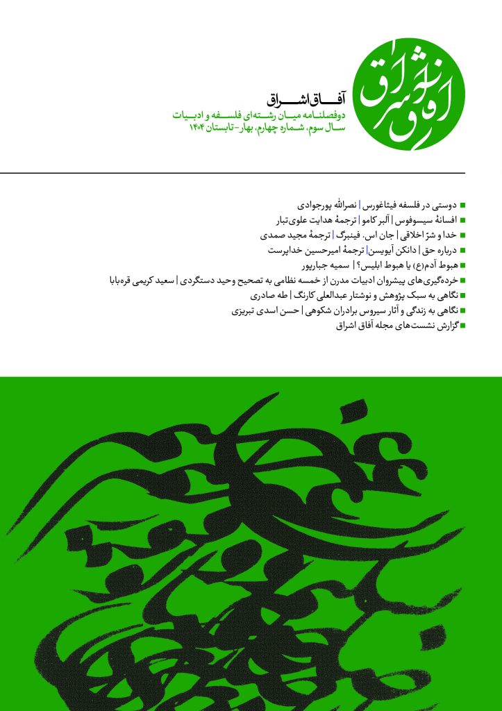شماره چهارم مجله آفاق اشراق به زودی منتشر می شود چند نکته درباره مقالات شماره چهارم مجله موضوع مقاله “دوستی در فلسفه فیثاغورث” نوشته استاد ارجمند دکتر پورجوادی بدیع و جالب توجه است چون از فیثاغورث نوشته ای درباره دوستی بر جا نمانده است و در تاریخ فلسفه نام فیثاغورث با موضوعات دیگری پیوند دارد… […]